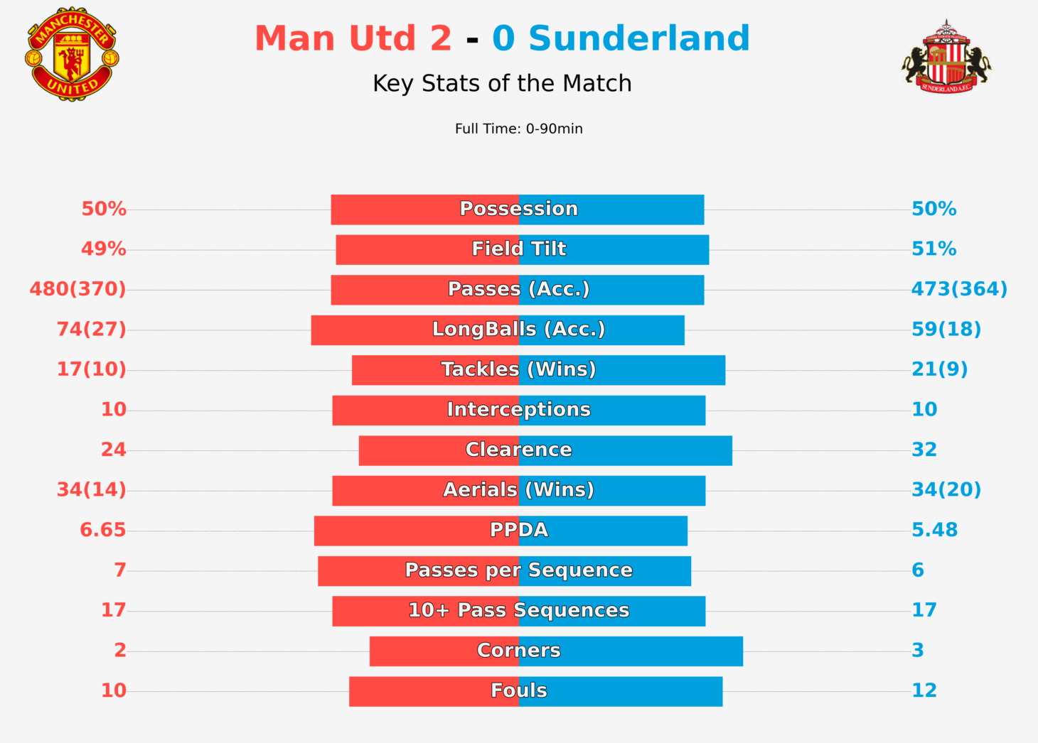Balanced on paper, better in practice. United’s structure told the story: more accurate passing and compact defending (xGA 0.71).