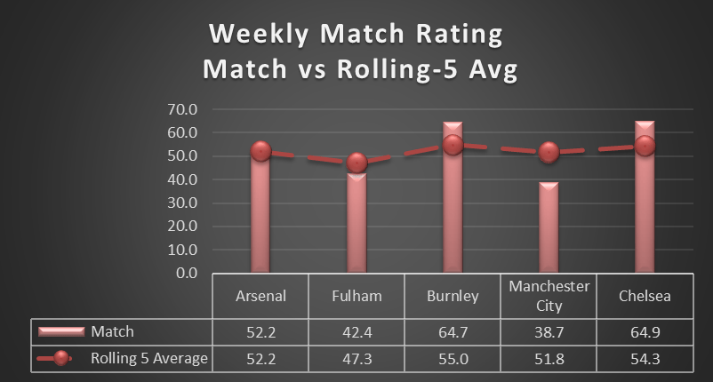 Weekly Match Rating: Chelsea match at ~65 as the rolling-5 average climbs.