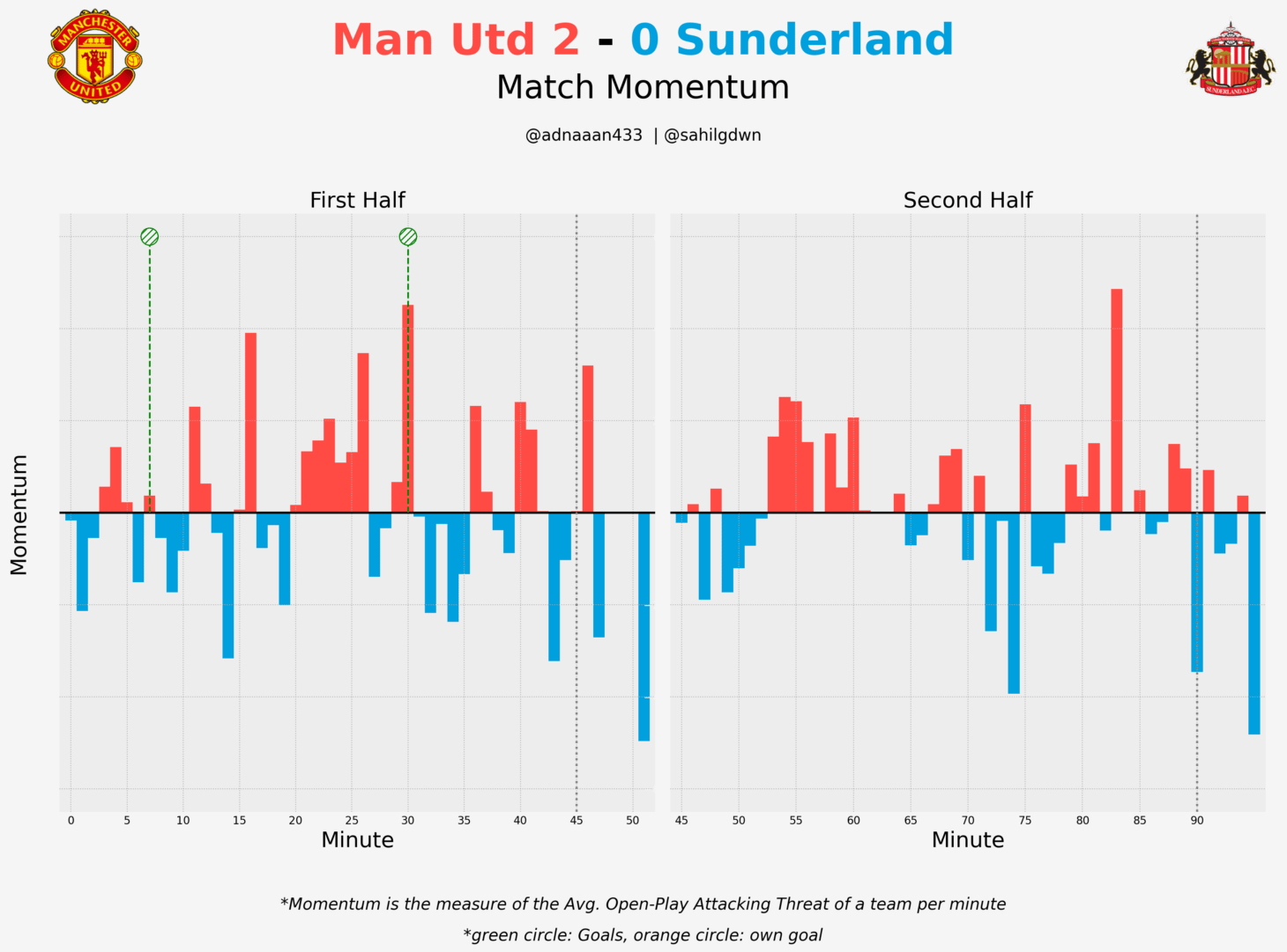 We really took it to them in the first half. The momentum chart shows wave after wave of United pressure. We were getting into dangerous areas and keeping Sunderland pinned back for long stretches. We grabbed both goals before the break which completely changed the complexion of the game.